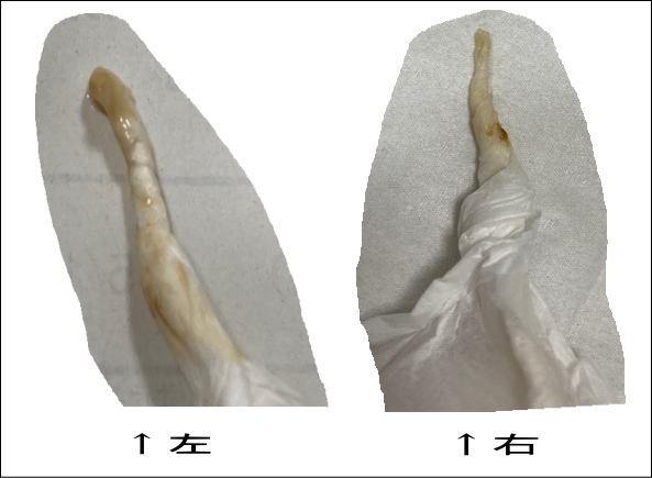 ↓色付きの耳だれ。綿棒が嫌いになってきたので、ティッシュをこよりみたいにして耳だれ吸い取ってます。