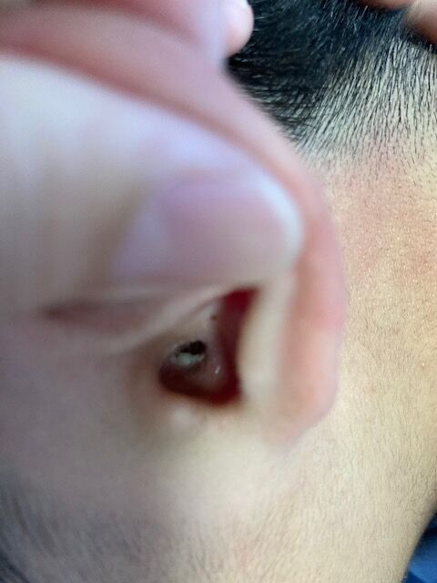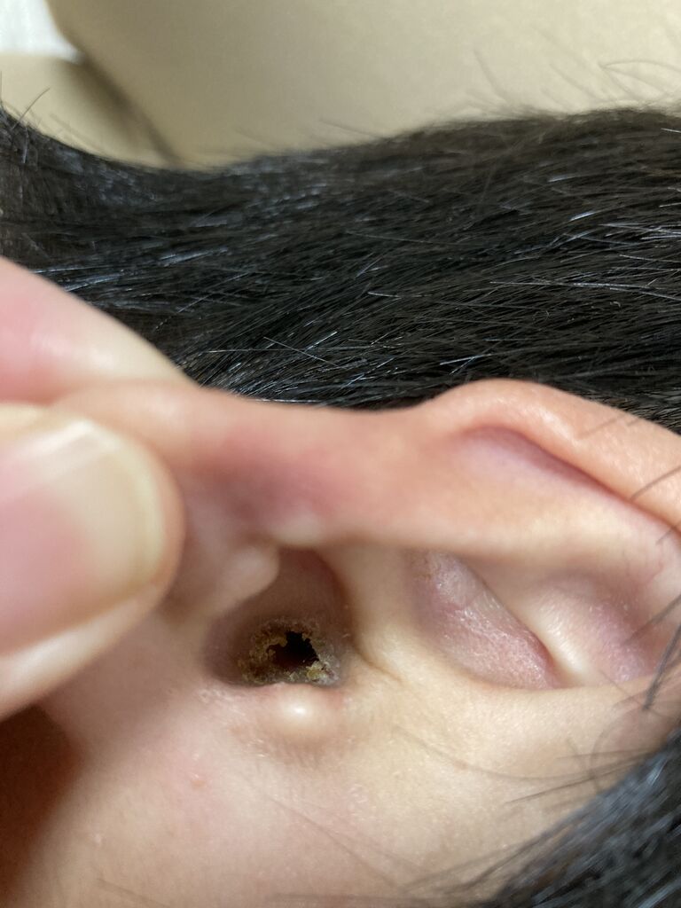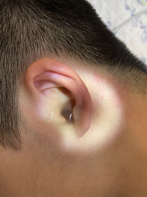 ↓左耳の淵にねばっこいものが・・・耳だれだぁ